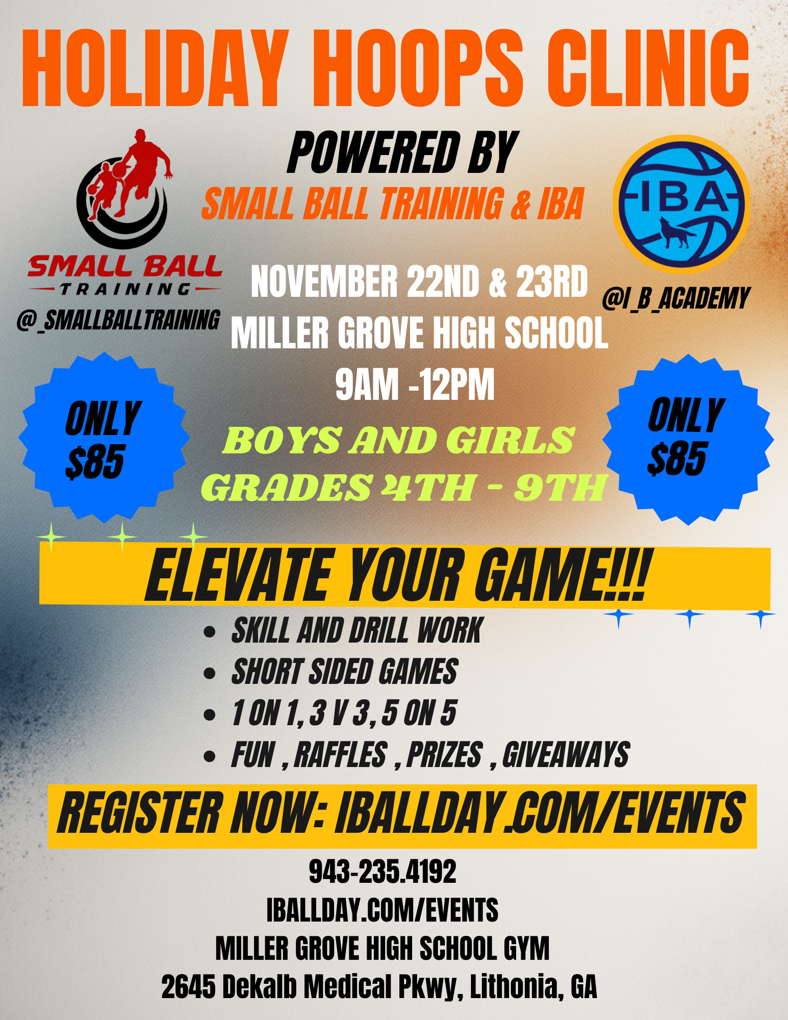 IBA Events › Holiday Hoops Clinic Image 1 of 1 Holiday Hoops Clinic $85.00 Skill and Drill WorkShort Sided Games1v1, 3v3, 5v5 GamesFun, Raffles, Prizes, and Giveaways Quantity: Register Added! Skill and Drill WorkShort Sided Games1v1, 3v3, 5v5 GamesFun, Raffles, Prizes, and Giveaways View fullsize